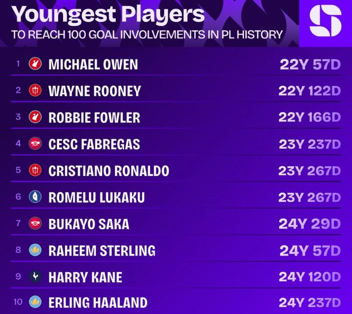 英超历史上上最年轻的参与100个进球记录: